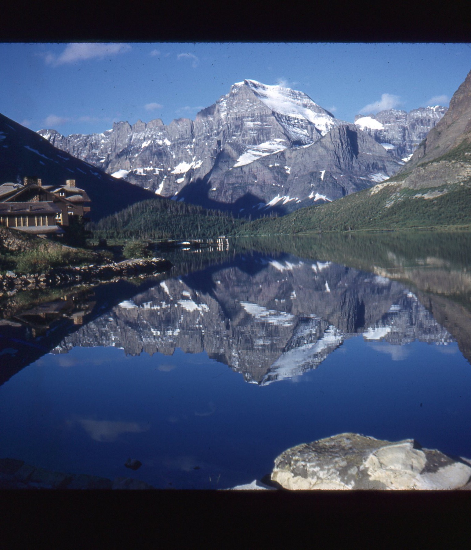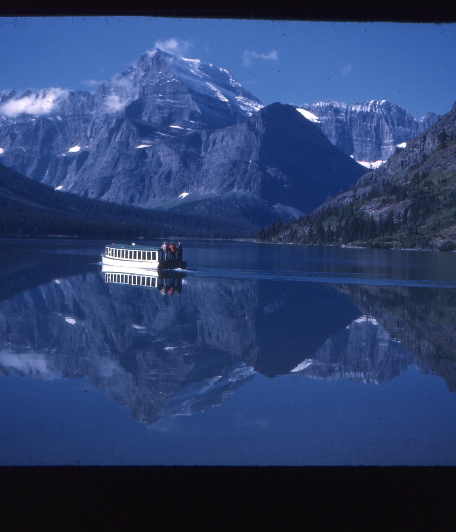 Many visitors to Glacier enjoyed crossing the lake from the lodge on boats which ferried passengers across the water to hiking trails – saving some time and many steps on what could easily be a full-day hike. Dad Baden led many of these hikes and traveled across this lake several times a week.