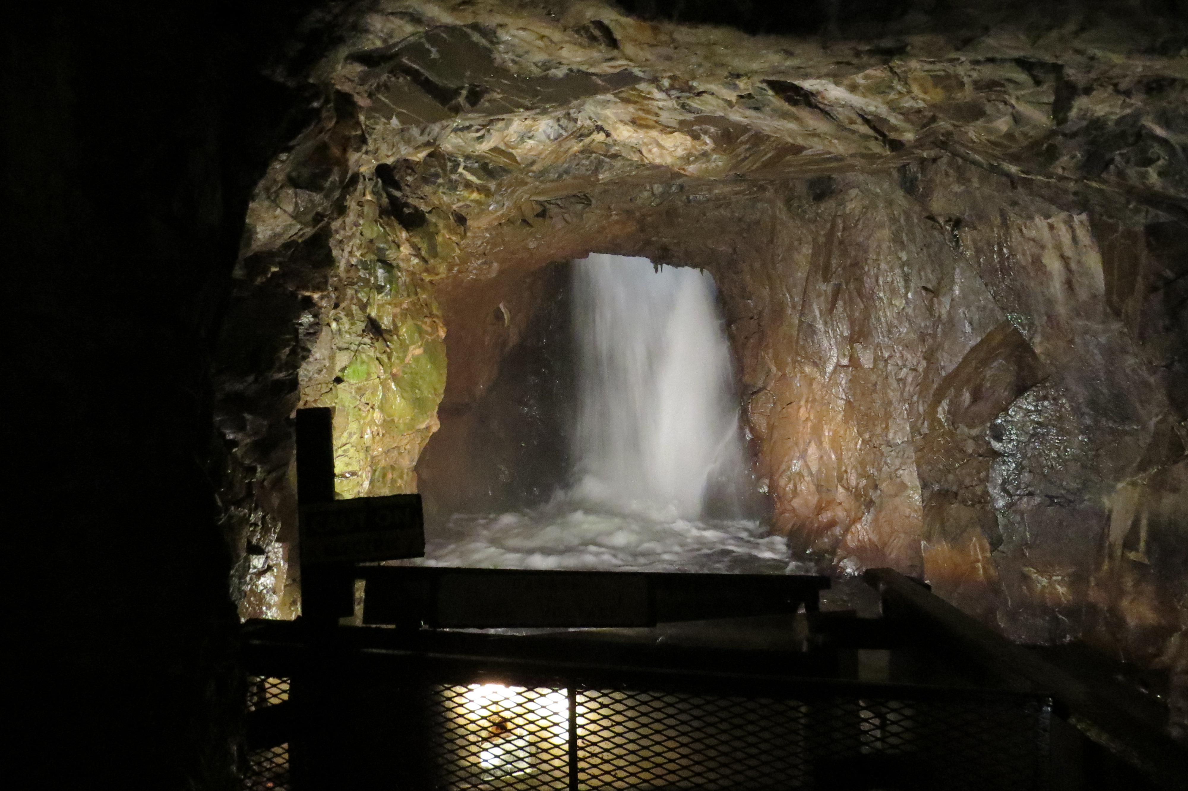 At Thunderhead Falls, just outside the entrance to Camp Rimrock, the outside water fall is set in contrast with the inner falls at the end of a six hundred foot mine shaft.