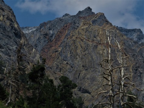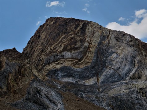 Dave and Jan are always fascinated by the geology of the mountains. What, apart from the flood of Noah’s day, could account for the folded strata of metamorphic rock, some of it at a 90 degree angle from the valley floor below?