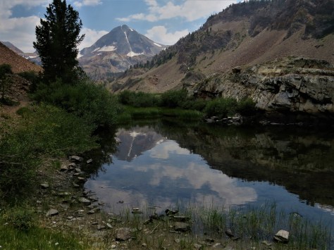 Because they were camped at the Convict Lake Campground Dave and Jan decided to take the Convict Lake Trail up to Mildred Lake and, perhaps, Dorothy Lake (though they didn’t make it that far this time around). The trail led into some beautiful country, but it was complicated by its 2,500 ft. climb! It began at the west end of Convict Lake where the Forest Service build a boardwalk because water flowing from the mountains would make crossing challenging without some elevation from the forest floor.