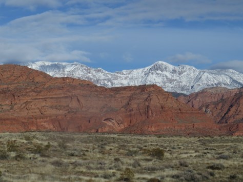 The drive along I-15 to Cedar City is very scenic, especially when winter snows coat the mountains behind some of the area’s characteristic red rocks.