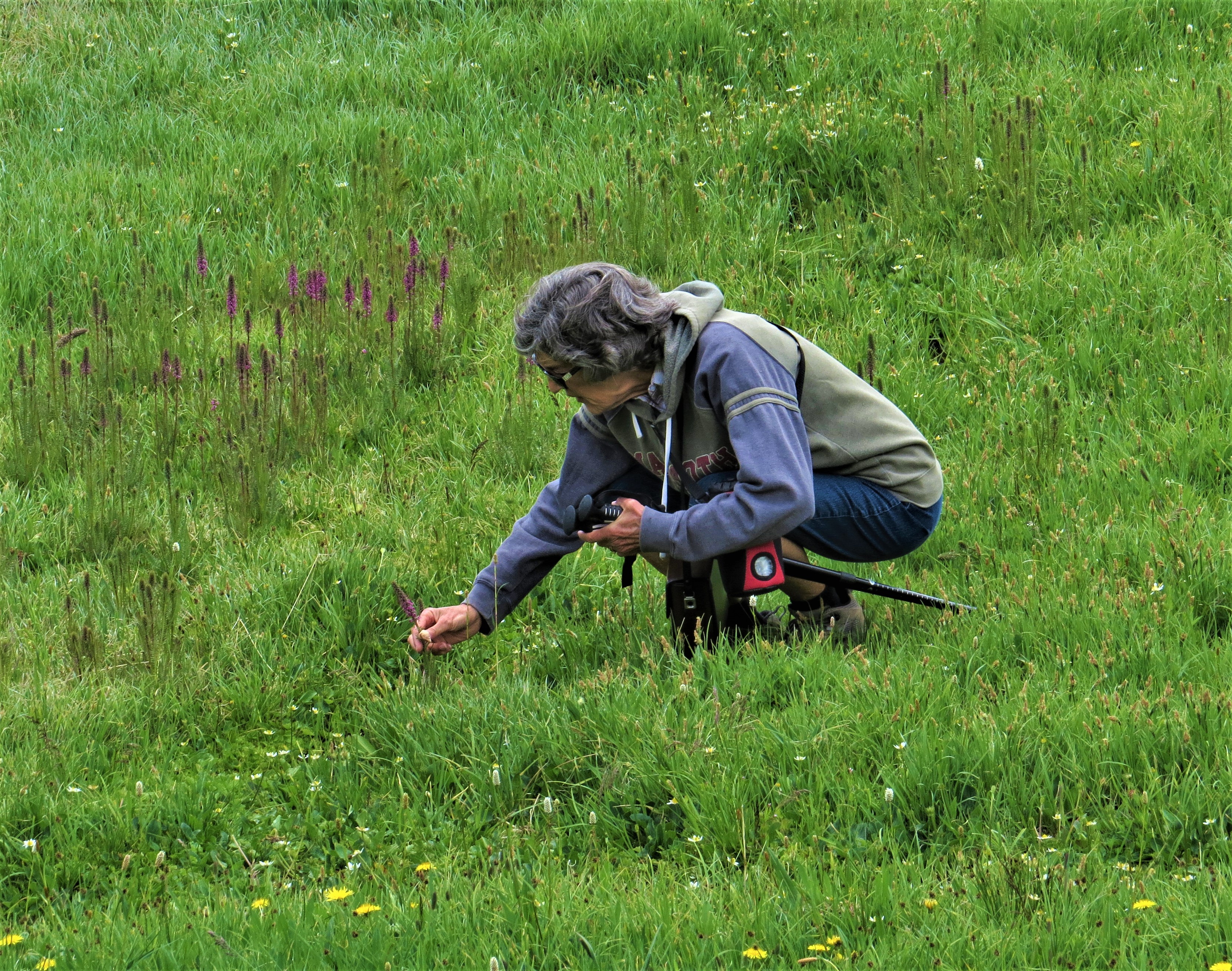 On a day when temperatures in the valleys of the area were typically in the 90’s, it was very refreshing to enjoy cooler temperatures which almost called for long-sleeved shirts or other warmer garments. Jan was well prepared for the cool air as she searched in a mountain meadow for Elephant Head Orchids.