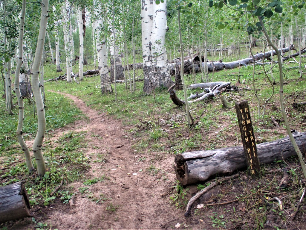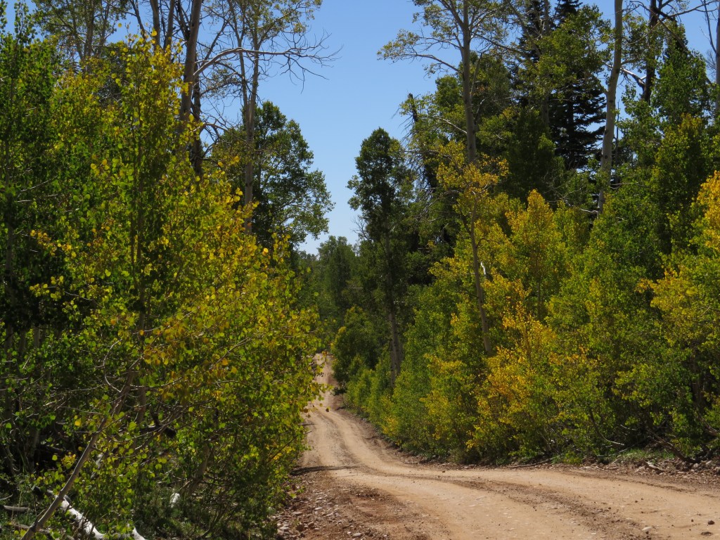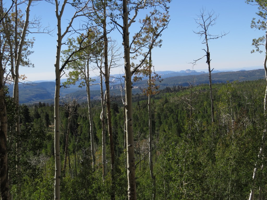 It was while Dave and Jan were camping at Duck Creek Campground in the mountains east of Cedar City several weeks back that they took a drive on dirt roads to view Cascade Falls – a small but interesting waterfall which flows under ground through lava tubes from Navajo Lake to an exit in a rocky wall along the Virgin River Rim. In the same area where the trailhead leads to Cascade Falls are trailheads going east and west along the Virgin River Rim Trail. Since that discovery there have been several hikes (and, in Dave’s case, bike rides) along various portions of the rim trail – with quite a few miles of trail yet to be explored. So on the last day of summer, thinking they might see some fall colors showing up among the aspen trees, the Balsleys hiked the section of the trail between the road from Highway 14 to Webster Flat and the site of the Dear Haven Campground (now closed for the season).