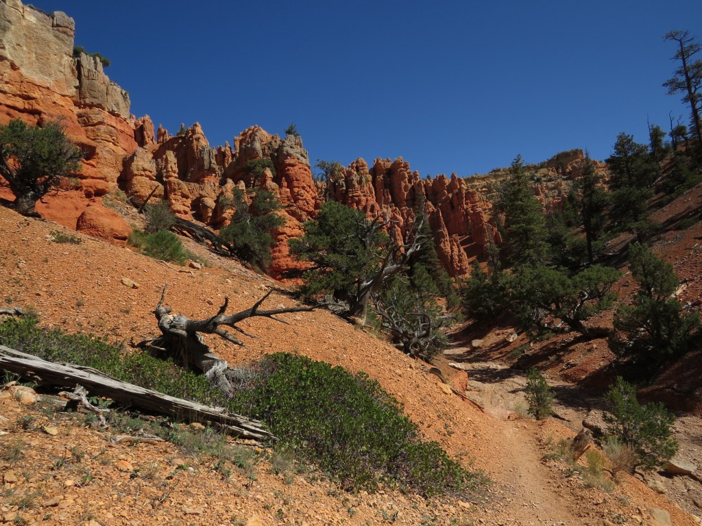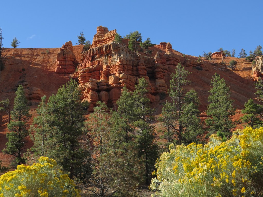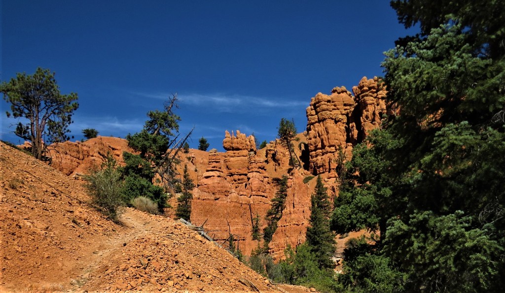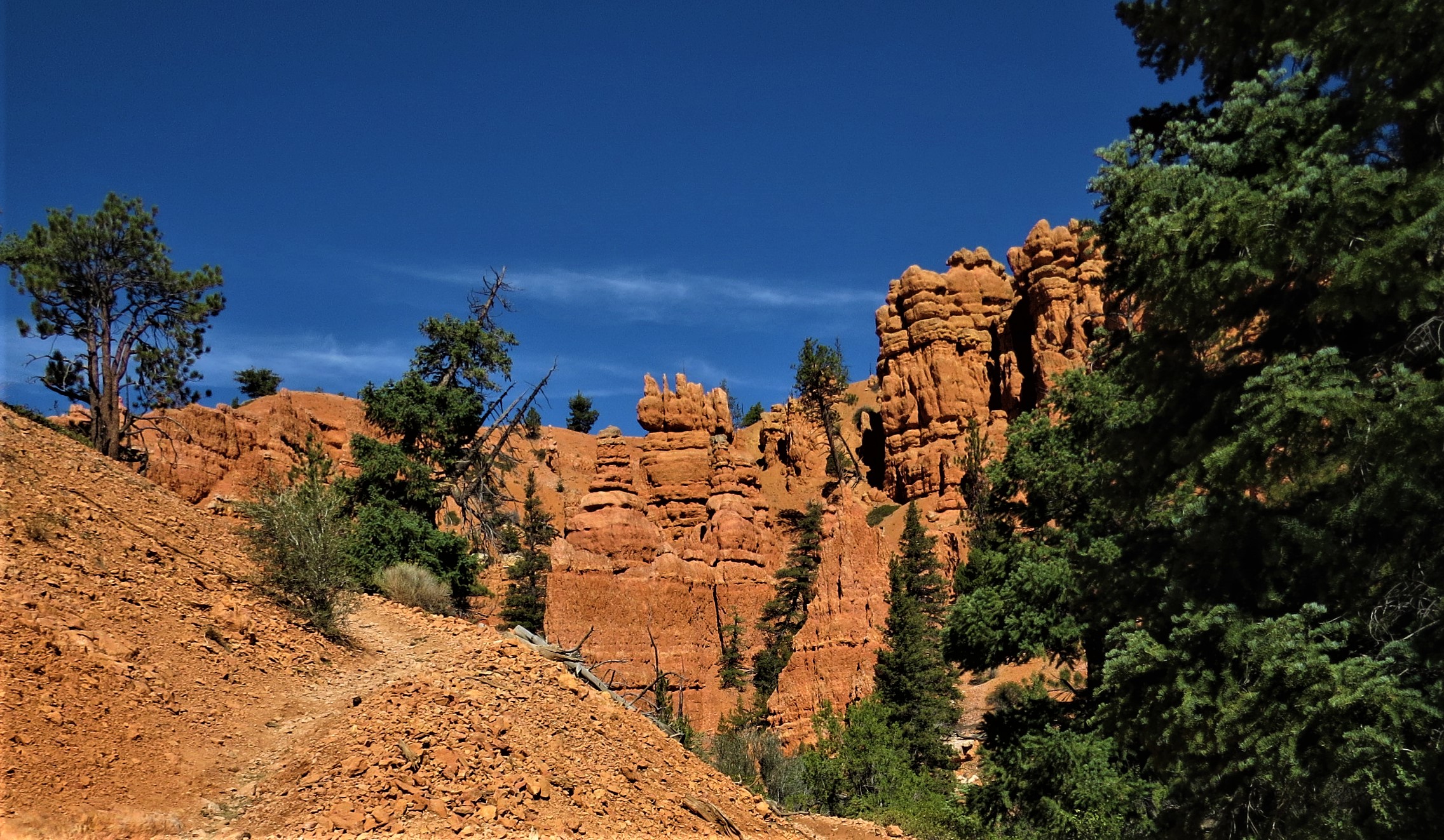The next day was an opportunity to take the Thunder Mountain trail up into the heights above the Red Canyon. After hiking around a mile there was a sign marking the entrance to Red Rock Canyon with some spectacular red rock “hoodos.”