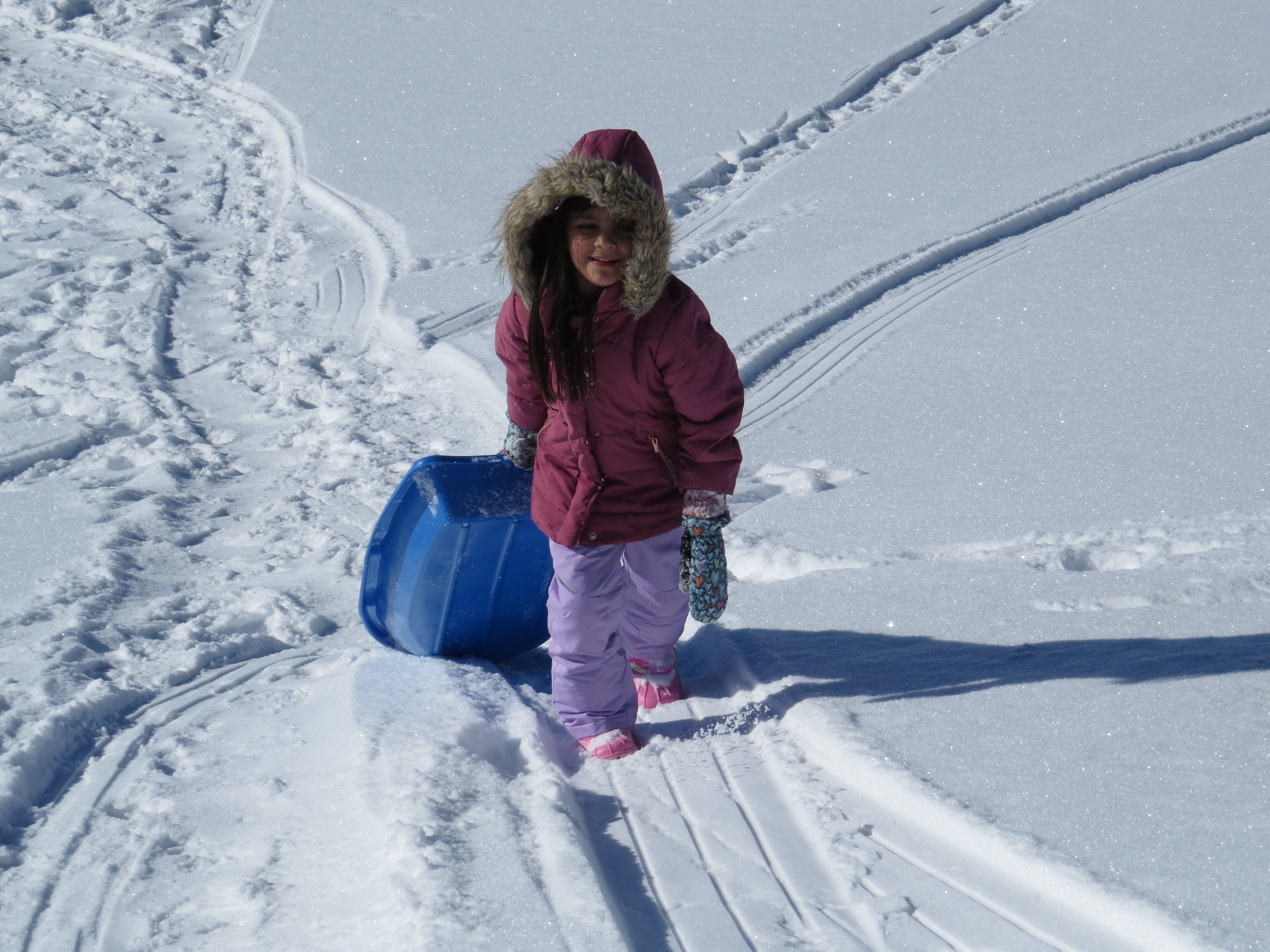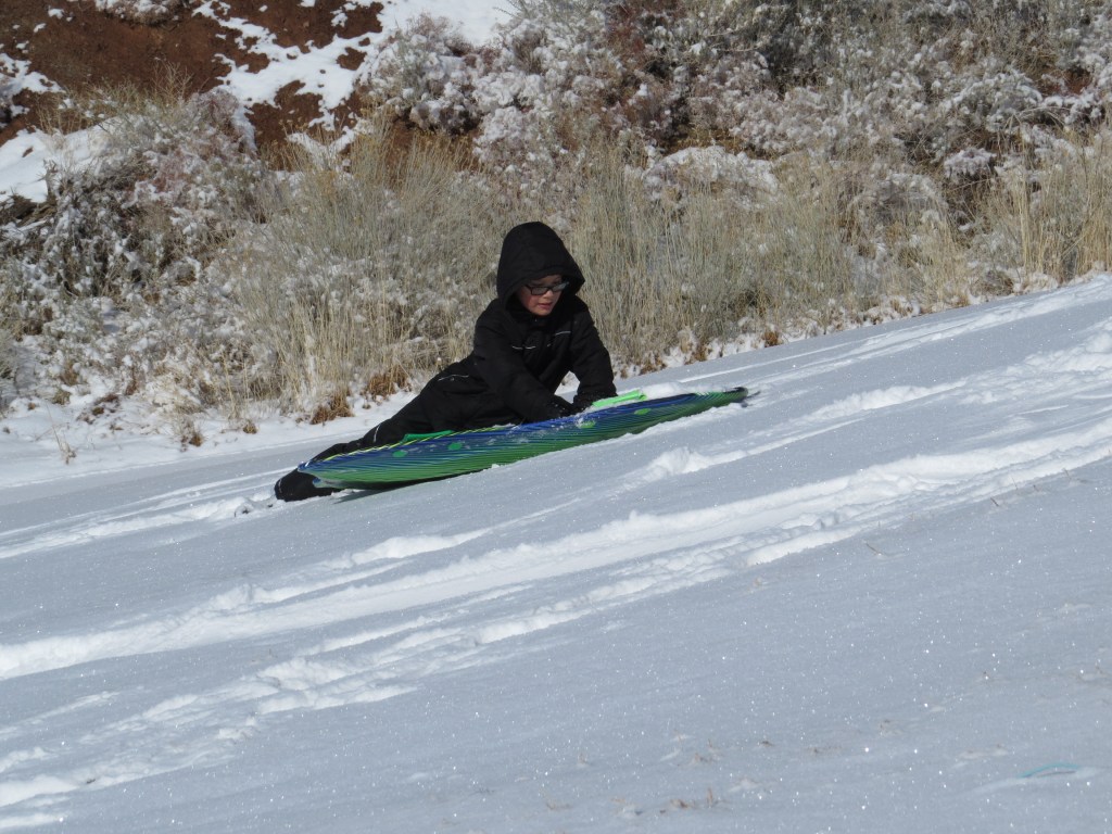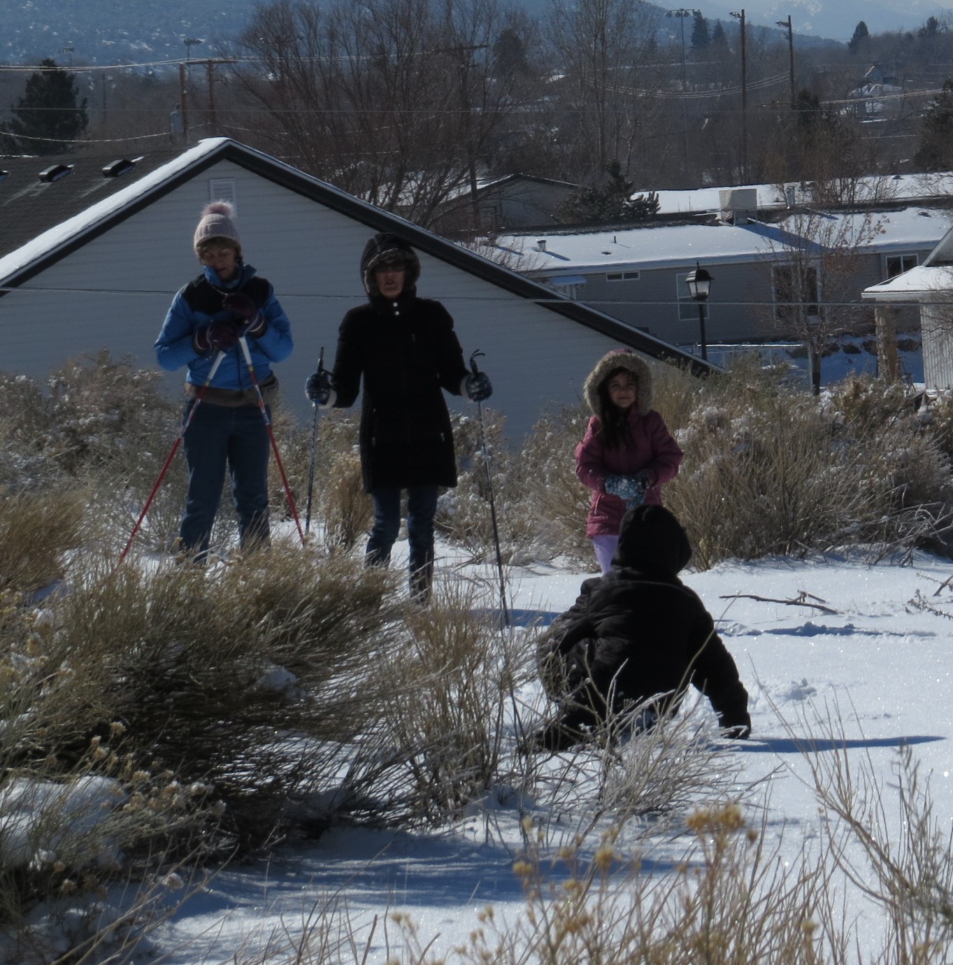 While the ladies were skiing, the grandchildren were having fun sledding down the hill at the golf course with a boy from the neighborhood – joined eventually by the neighbor who had taken off the skis for some sledding fun on her own and with Dave and Jan’s granddaughter Erin.