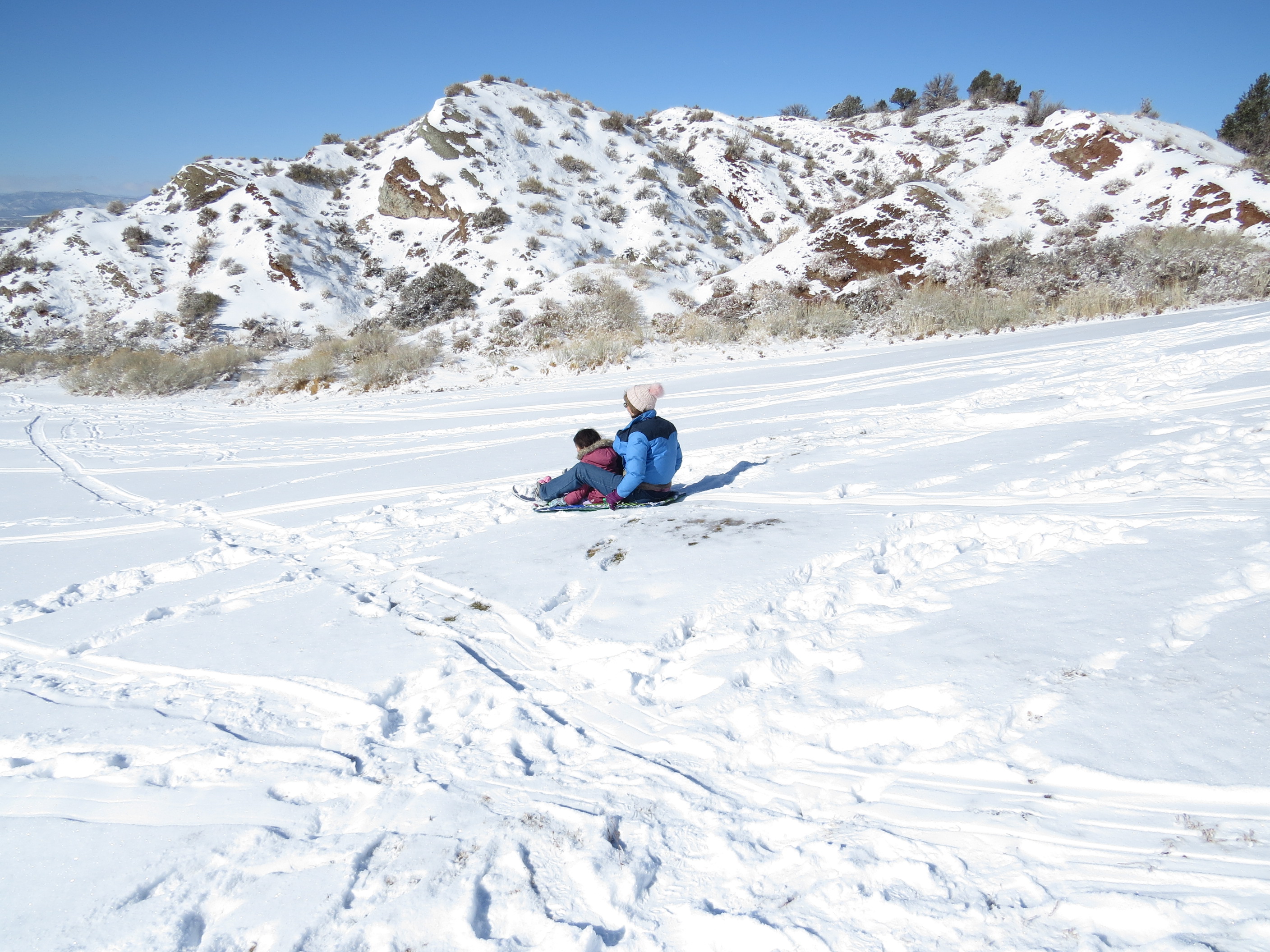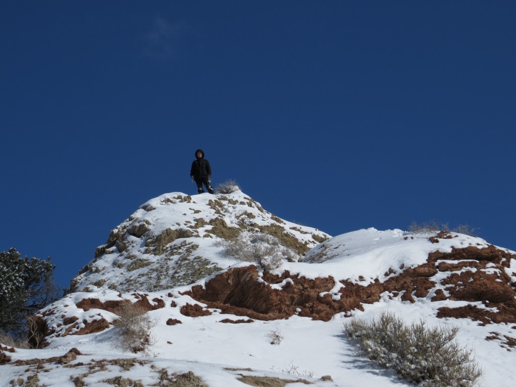 Ryan took a break from sledding with the neighbor boy to climb to the top of the hill as “king on the mountain.”