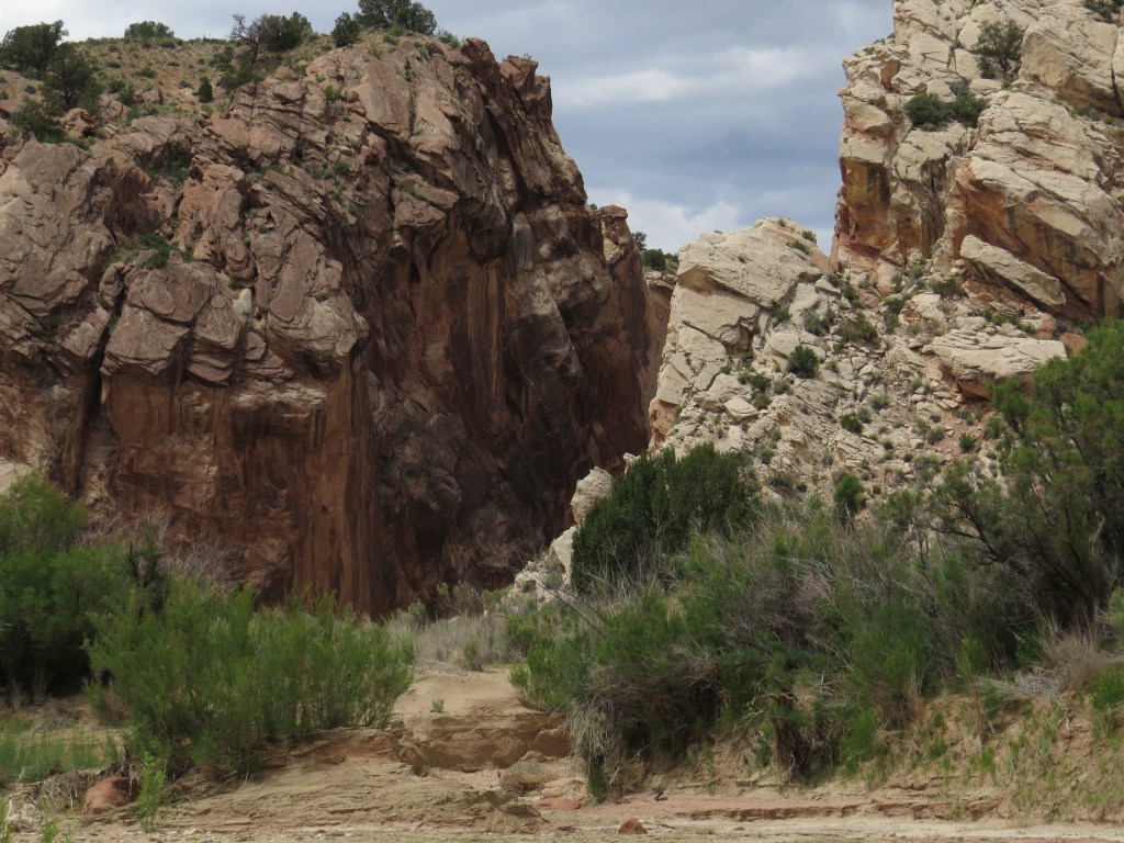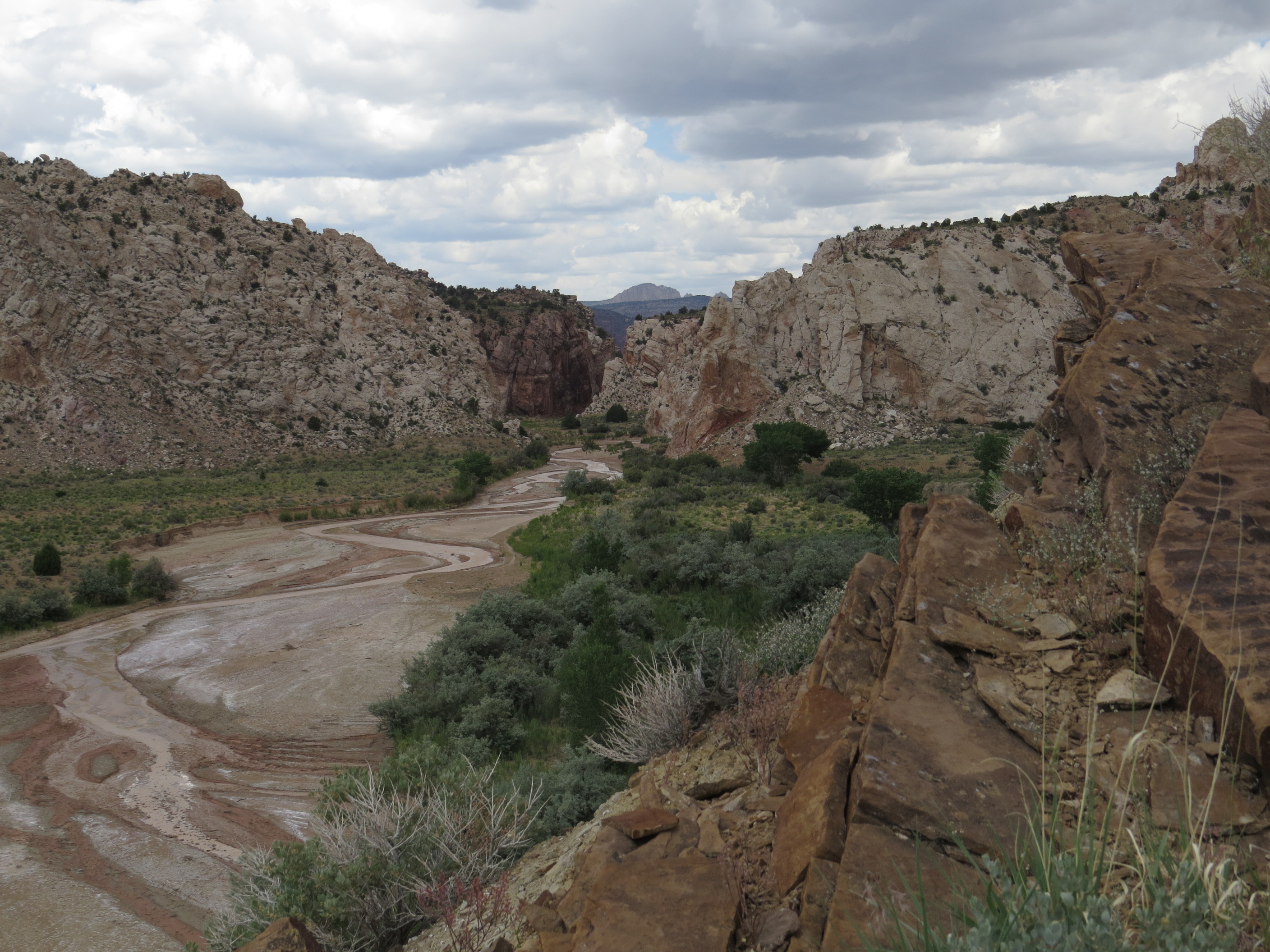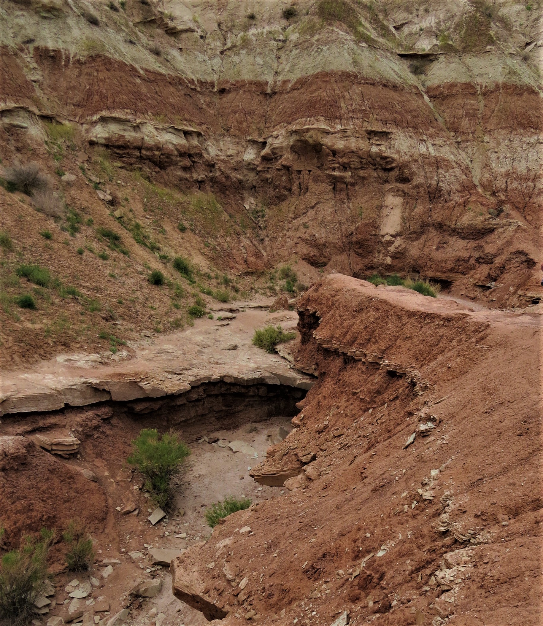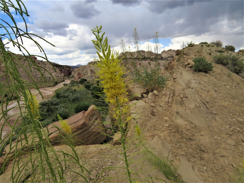 After a visit to the Visitors’ Center in Kanab, they headed east of town on the highway, then north for around 10-12 miles in search of a “slot canyon” known as Paria Box. What they discovered was the entrance to Paria Canyon which takes those who hike it for fifty miles upstream in a narrow canyon which has no exits along the route! Because the Paria River was filling even the canyon entrance, Dave and Jan only got close enough to take some pictures – enjoying some of the picturesque geology and some of the spring flowers in the process.