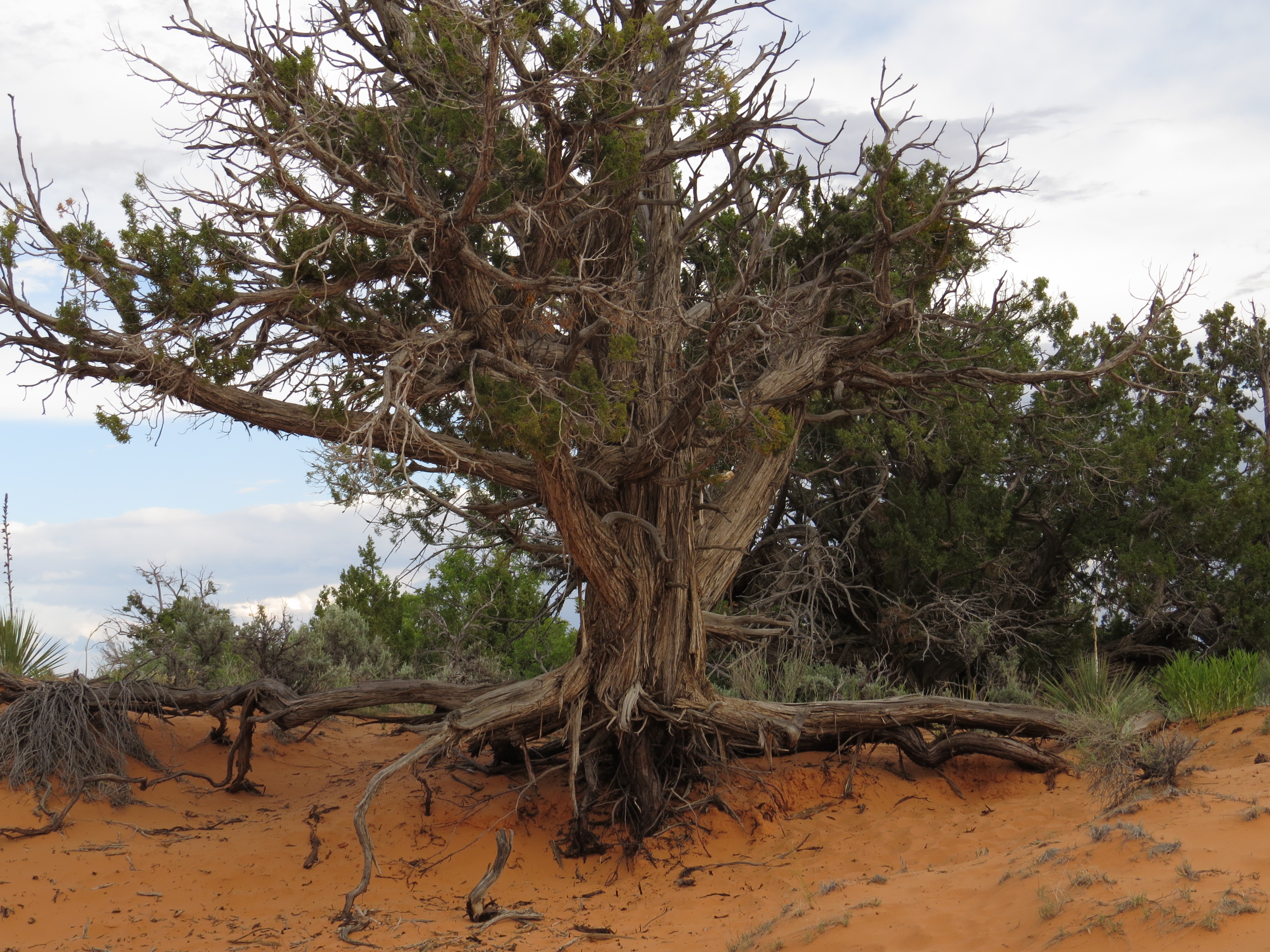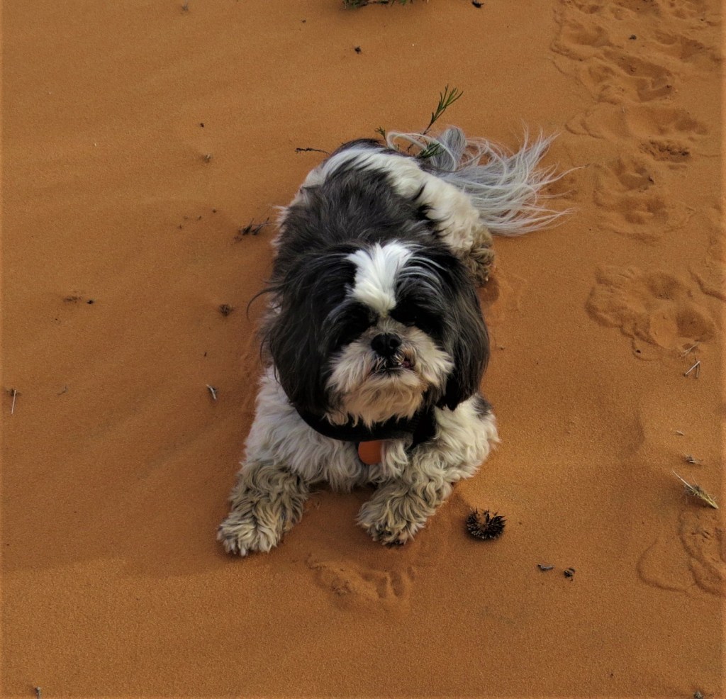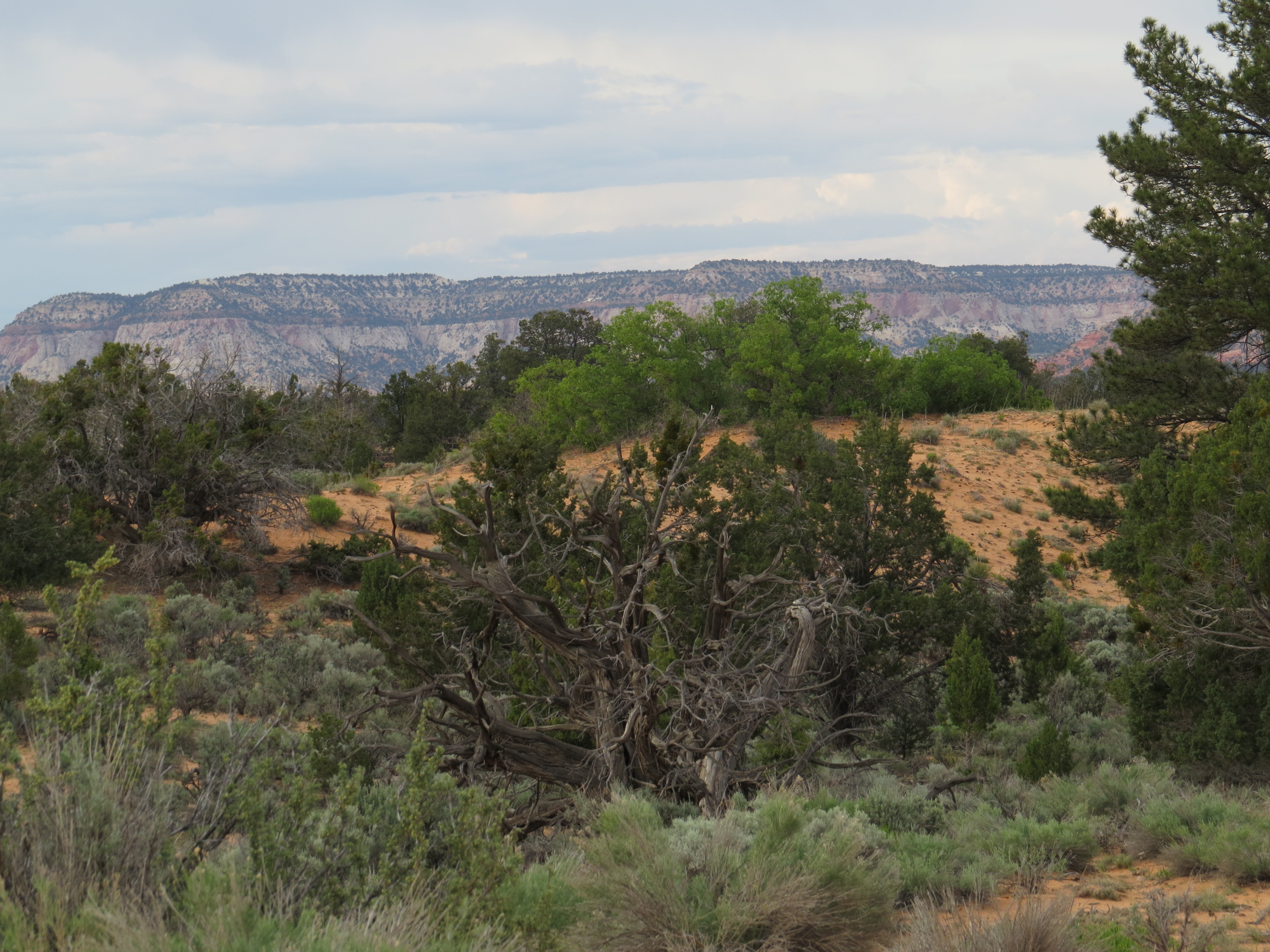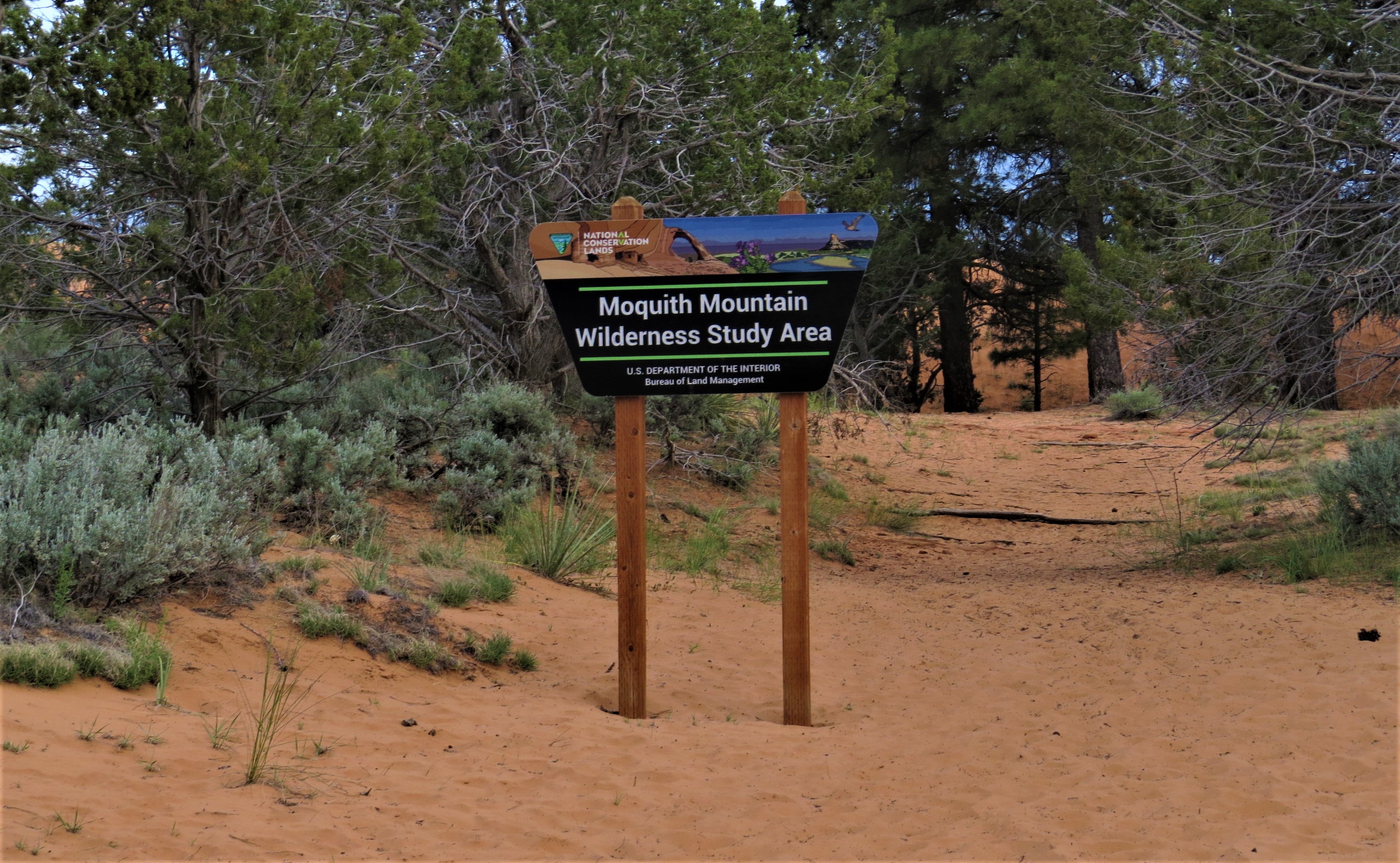 Ponderosa Pines Campground is only a few miles east of Coral Pink Sand Dunes State Park – a park which includes large dunes of colorful sand which visitors can climb or glide down on sand boards something like the boards used in skiing. What Dave and Jan didn’t realize when they checked into the camp ground was the fact that they were just across the highway from the coral pink sands of the Moquith Mountain Wilderness Study Area with coral pink sands in smaller dunes, featuring a variety of plant species and some natural beauty of its own – including views of the rocky bluffs just north of Kanab.