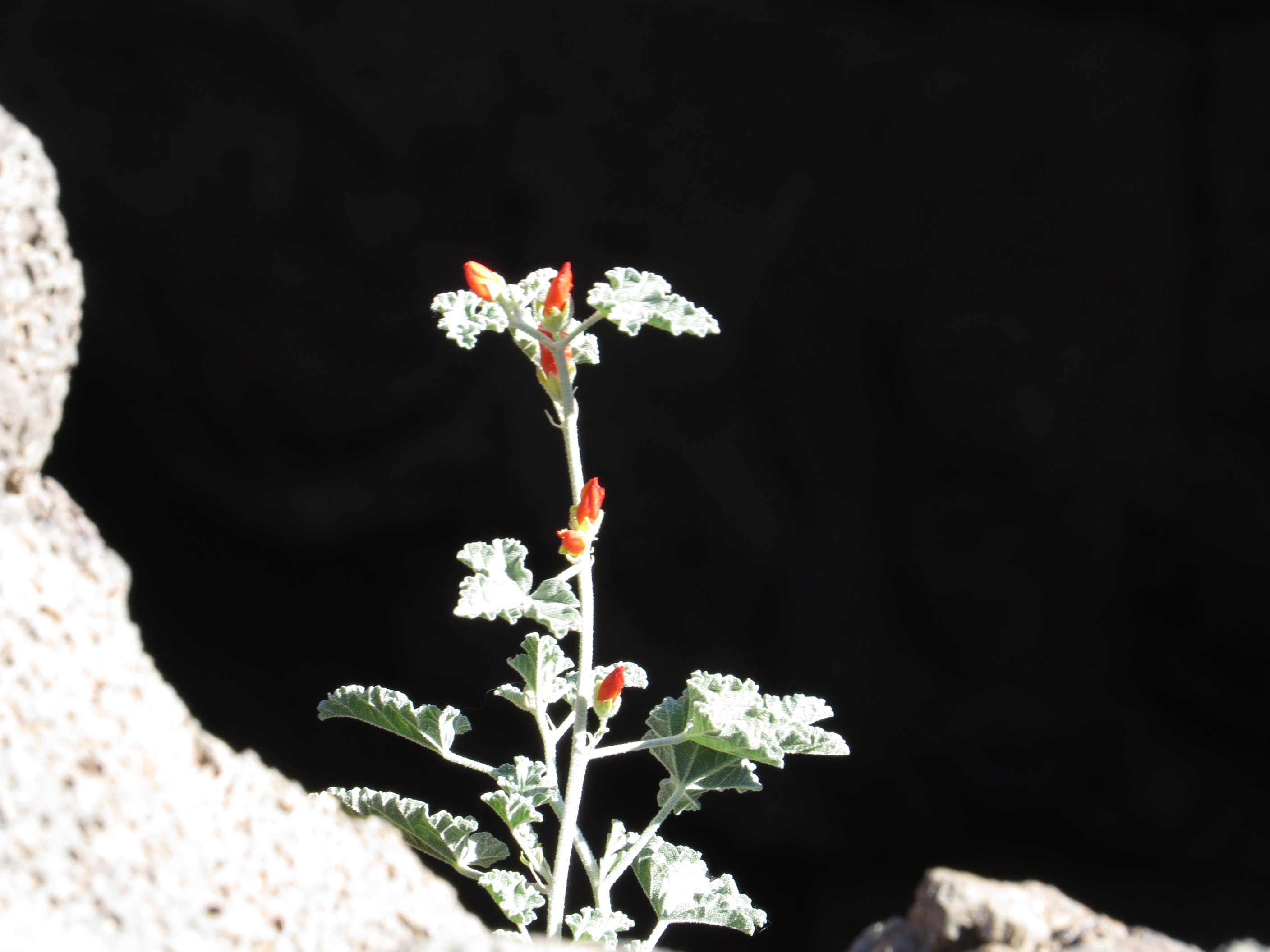 A small flower hung tenaciously to a lava cave, with a healthy display of Cholla cactus not far away.