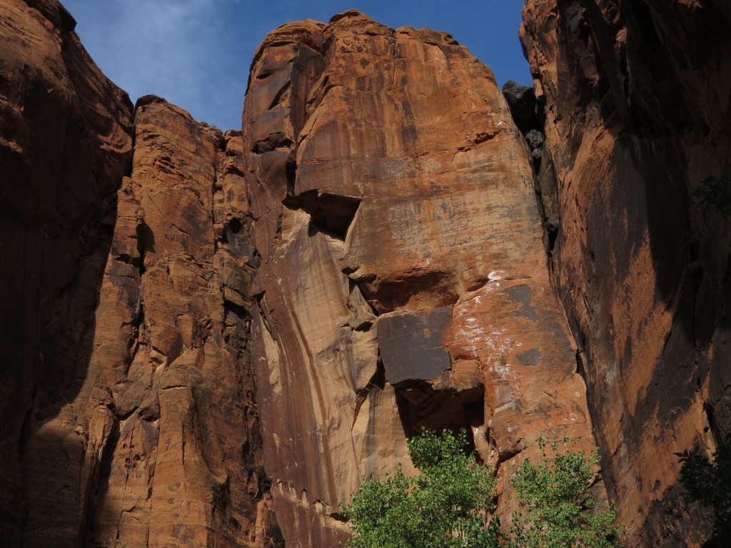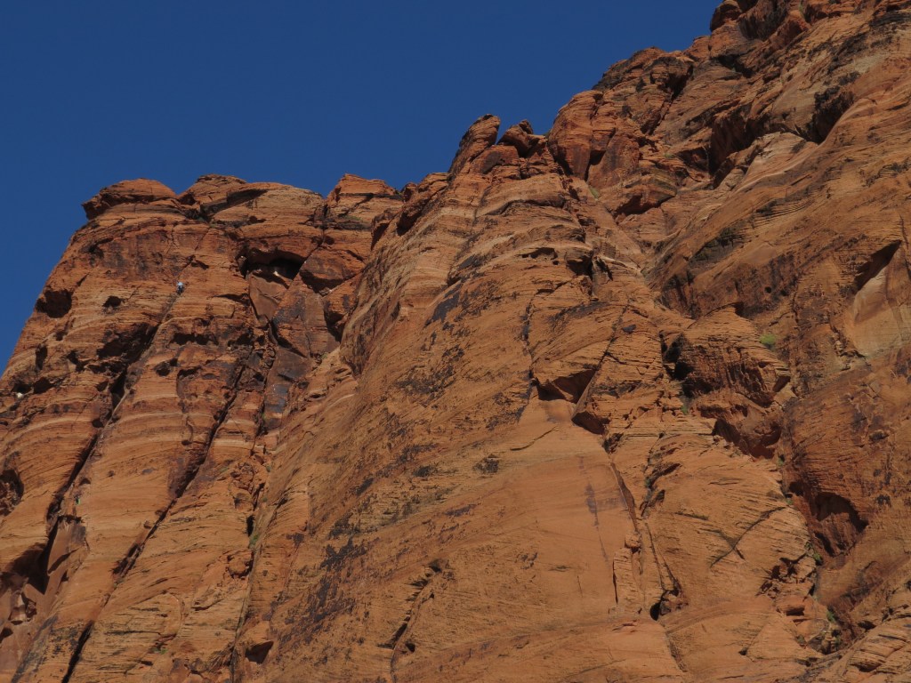 Farther south in the canyon high red rock walls were dotted with white specks – rock climbers testing their skills – and maybe risking their lives in view of the slick surfaces and heights they were navigating.