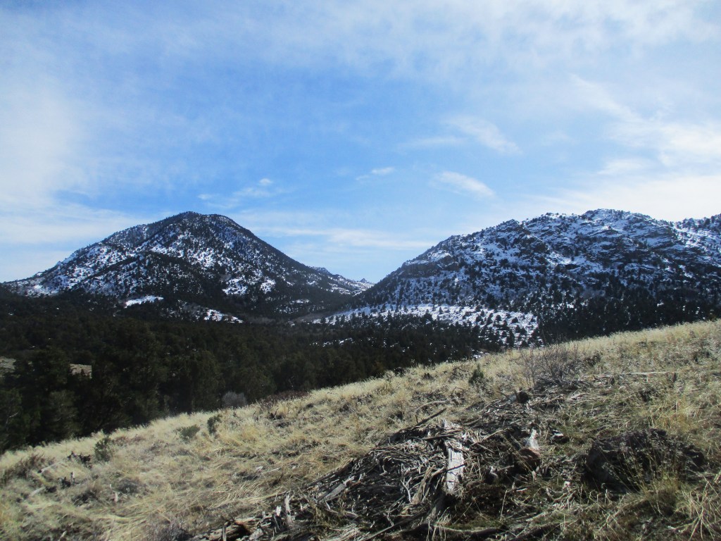 A dirt trail around a quarter of a mile in length leads to the top of the ridge where the rocky outcrop is. Across the dirt road from the trail are some snow-capped mountains with elevations at around 7,000 feet.