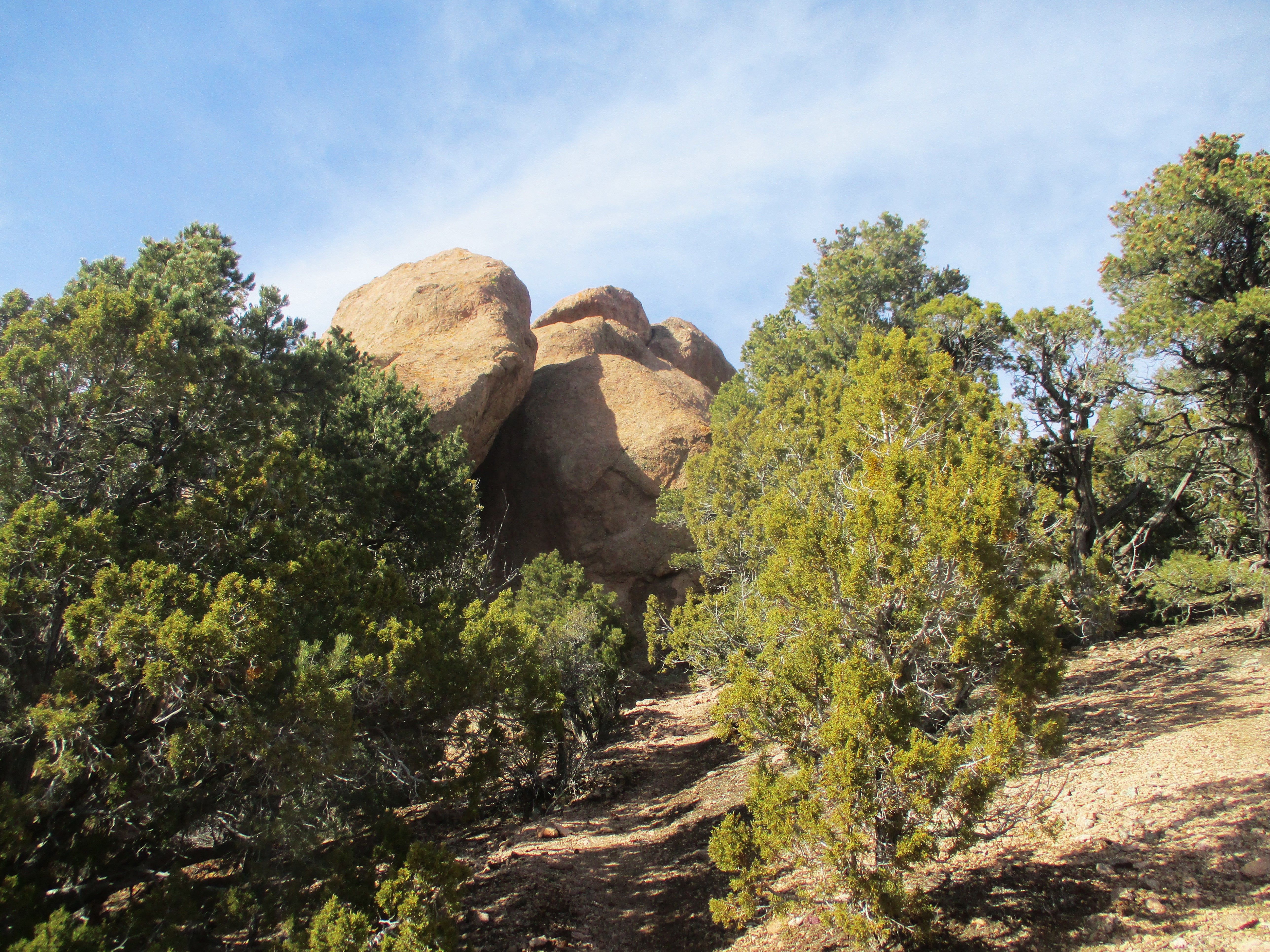 The trail enters a forest of pinyon pines and juniper trees where the rocky outcrop is located.