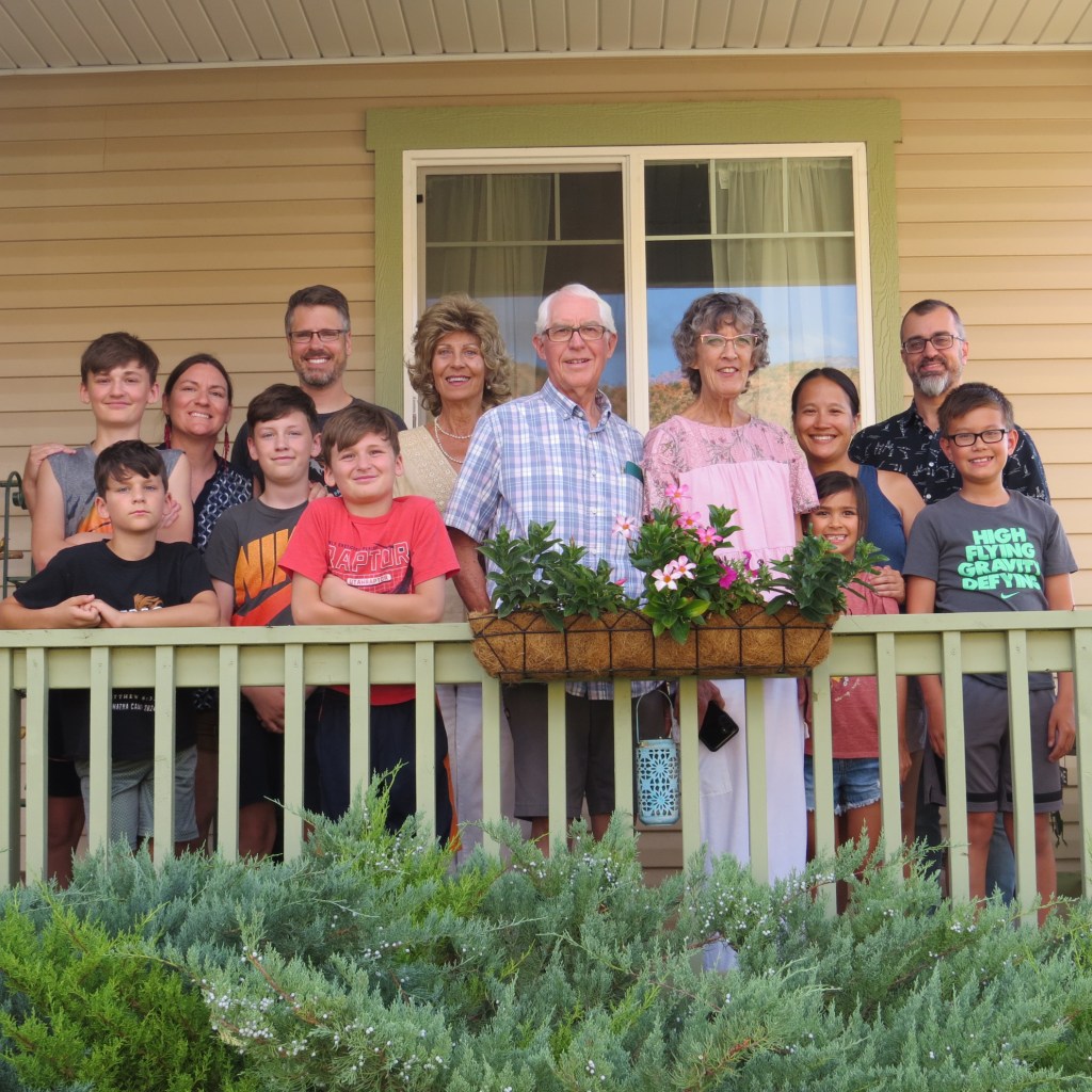 The Crandalls’ visit to Cedar City concluded with a family dinner on Jan’s birthday (a date which Jan shares with Kathleen, good friend and neighbor), so Kathleen was included in the family picture taken on the front porch.