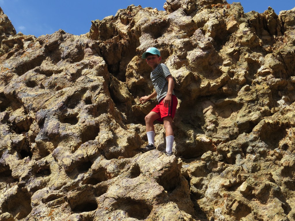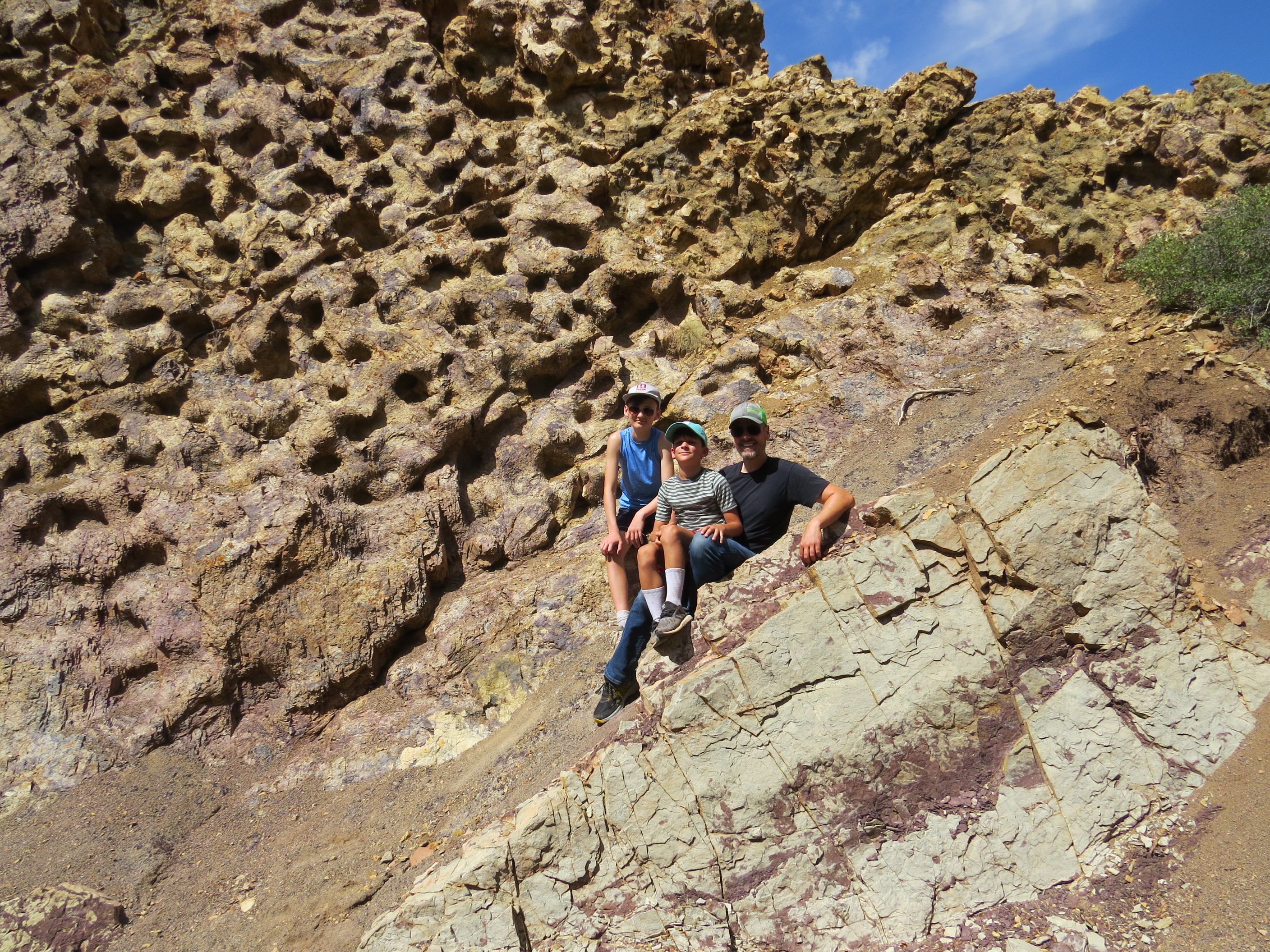 Hiking down one of the many washes to the canyon floor led the hikers by an interesting rock formation, which Jan and some of her lady friends have named the Honeycomb, a formation which Ephraim and Silas and Andrew climbed and posed on long enough for a photo.