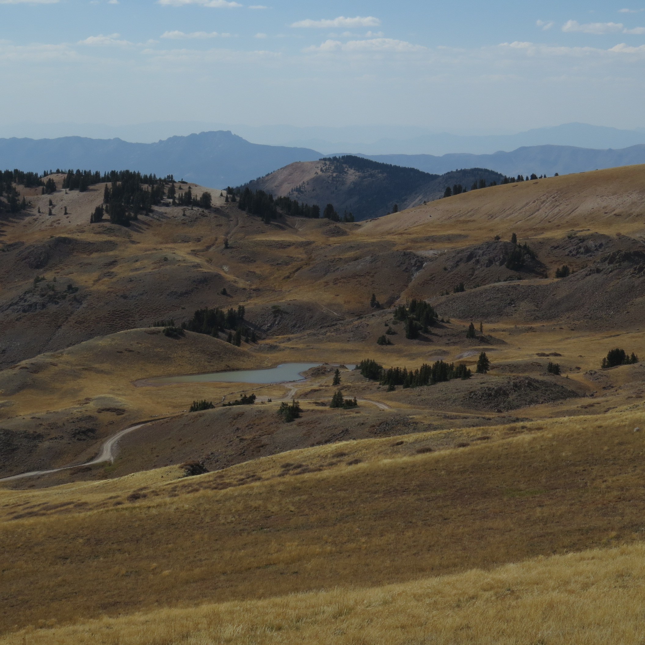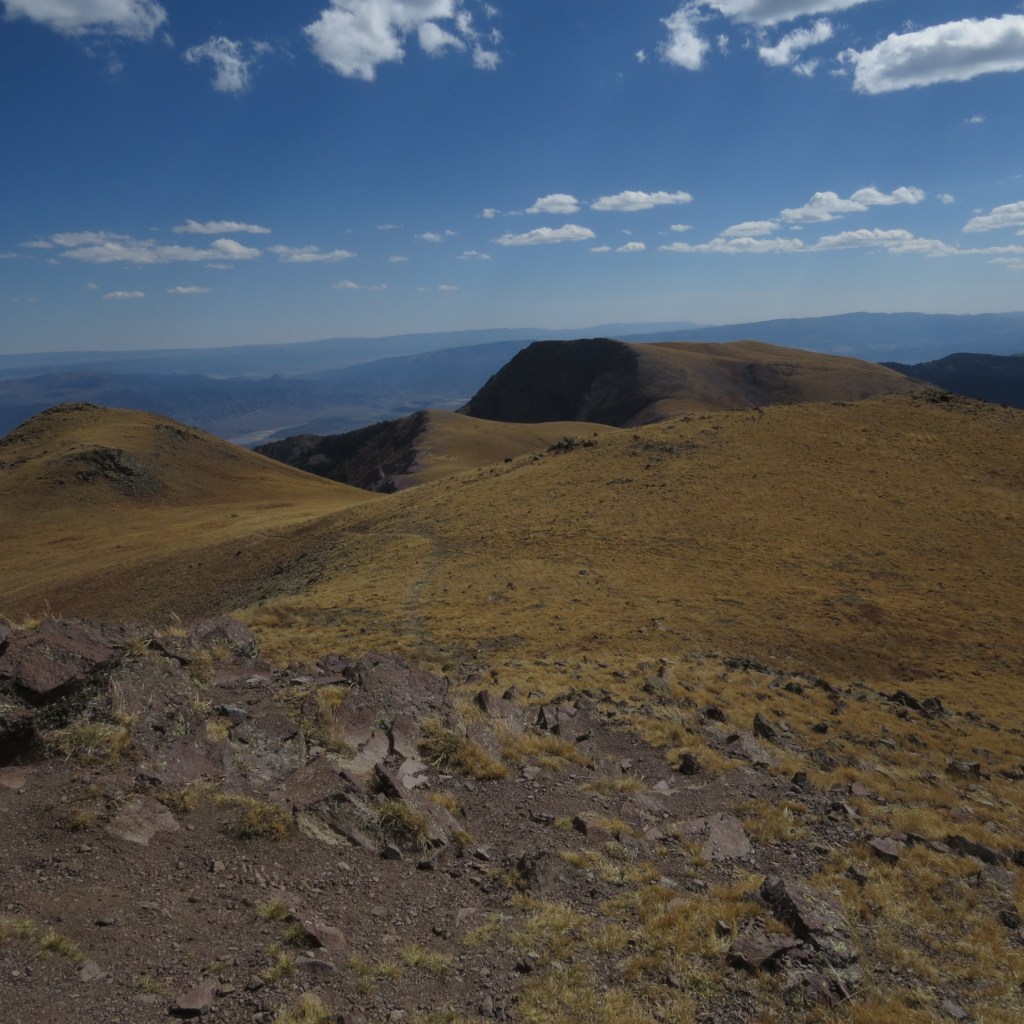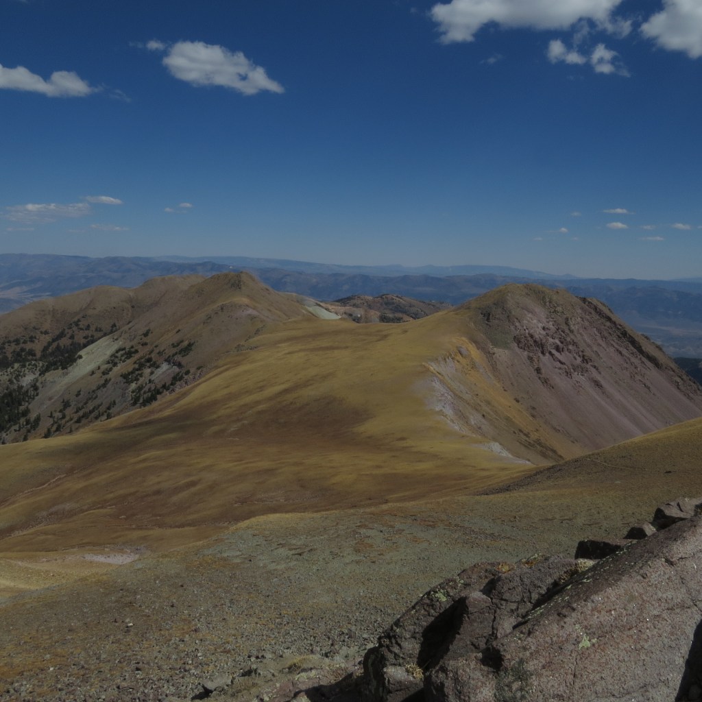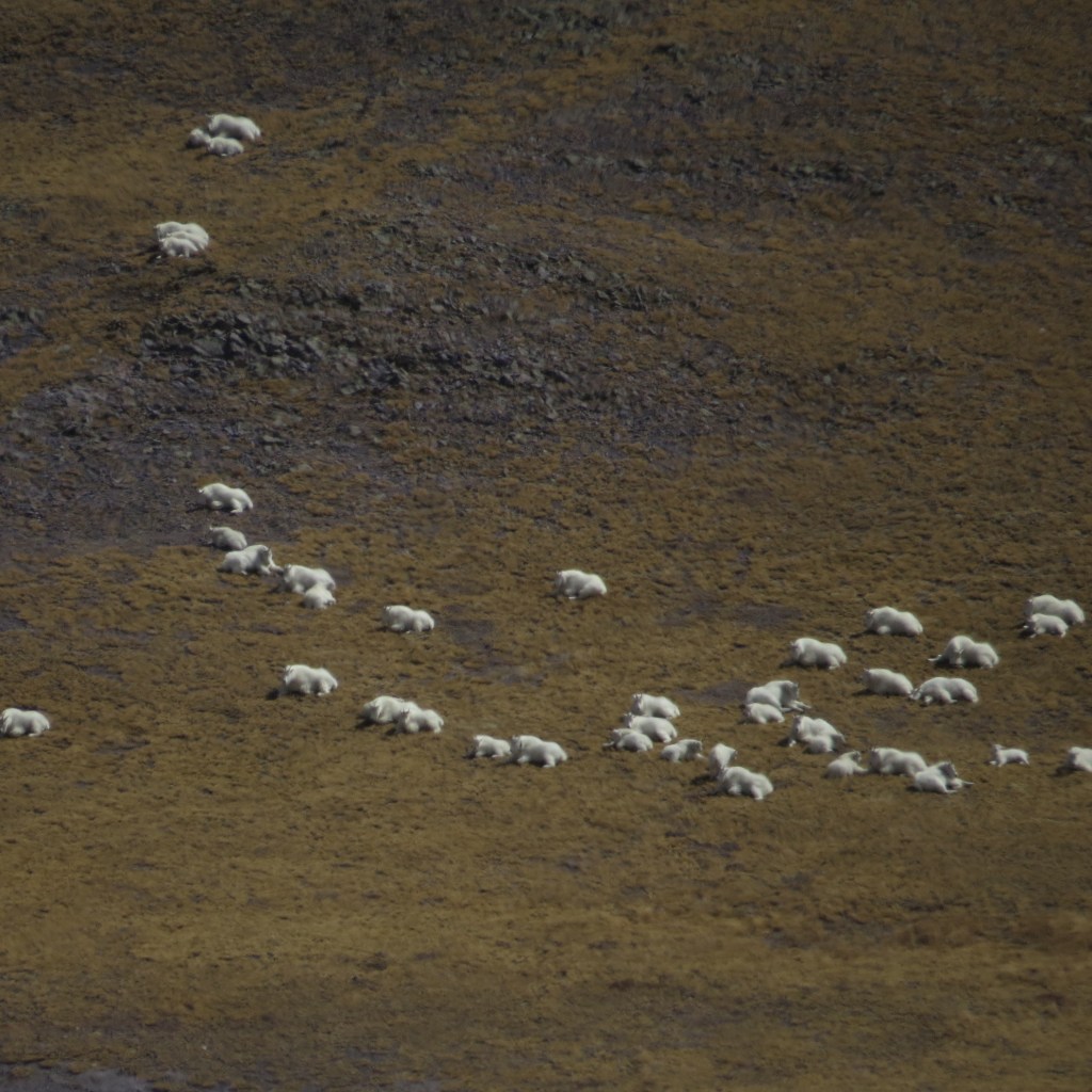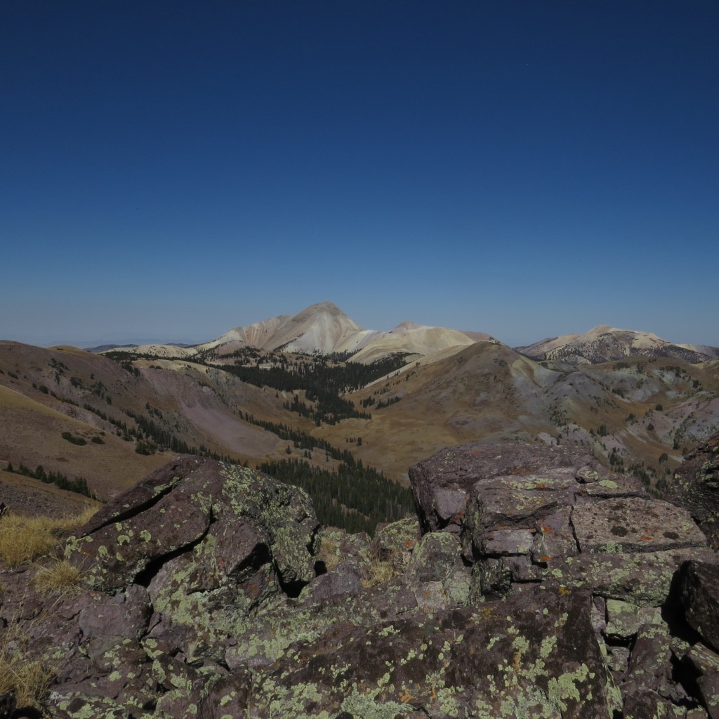 And any hike in the heights of the Tushars offers the prospect of a view of the Mountain Goats which the Utah Division of Wildlife introduced from Washington State. Dave’s last hike up the Delano Peak trail took him much closer to the goats than this hike did, but it was satisfying to see them from a distance, so Dave got a picture of the flock – though the strong wind made it difficult to hold the camera still.
