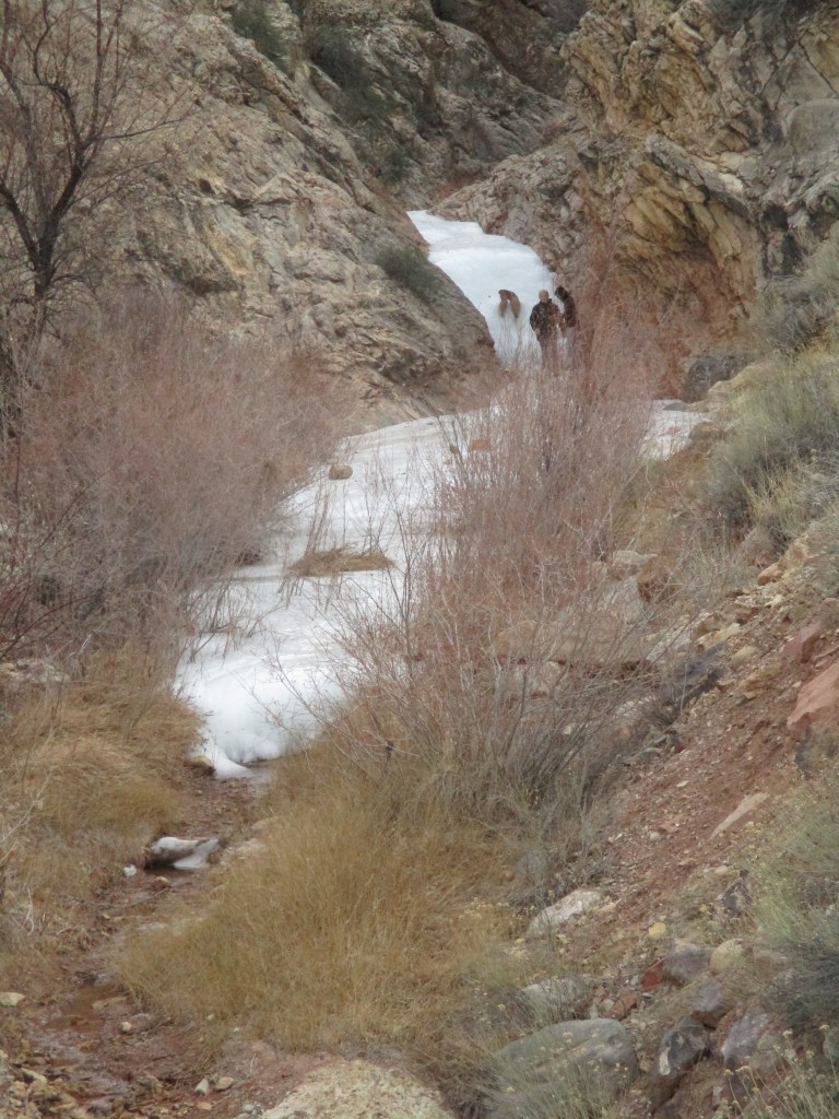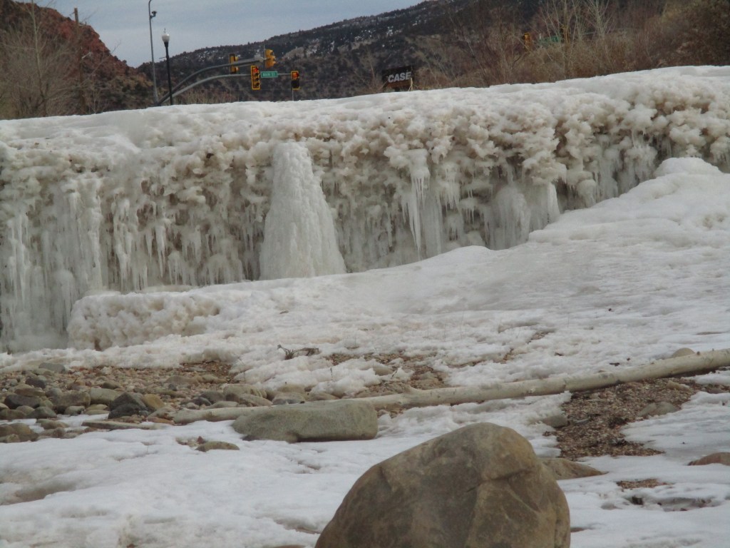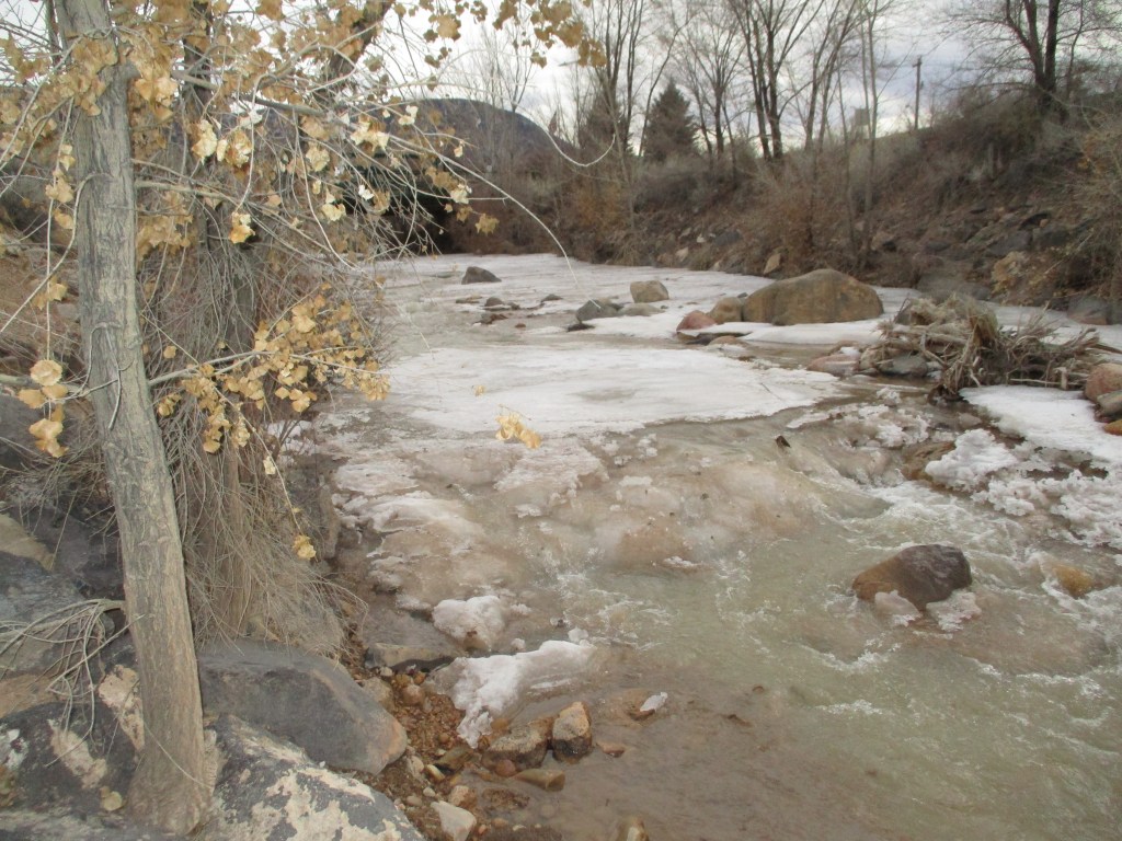 Farther down the creek, near the Cedar City Visitors’ Center there is a third waterfall which has been icy.