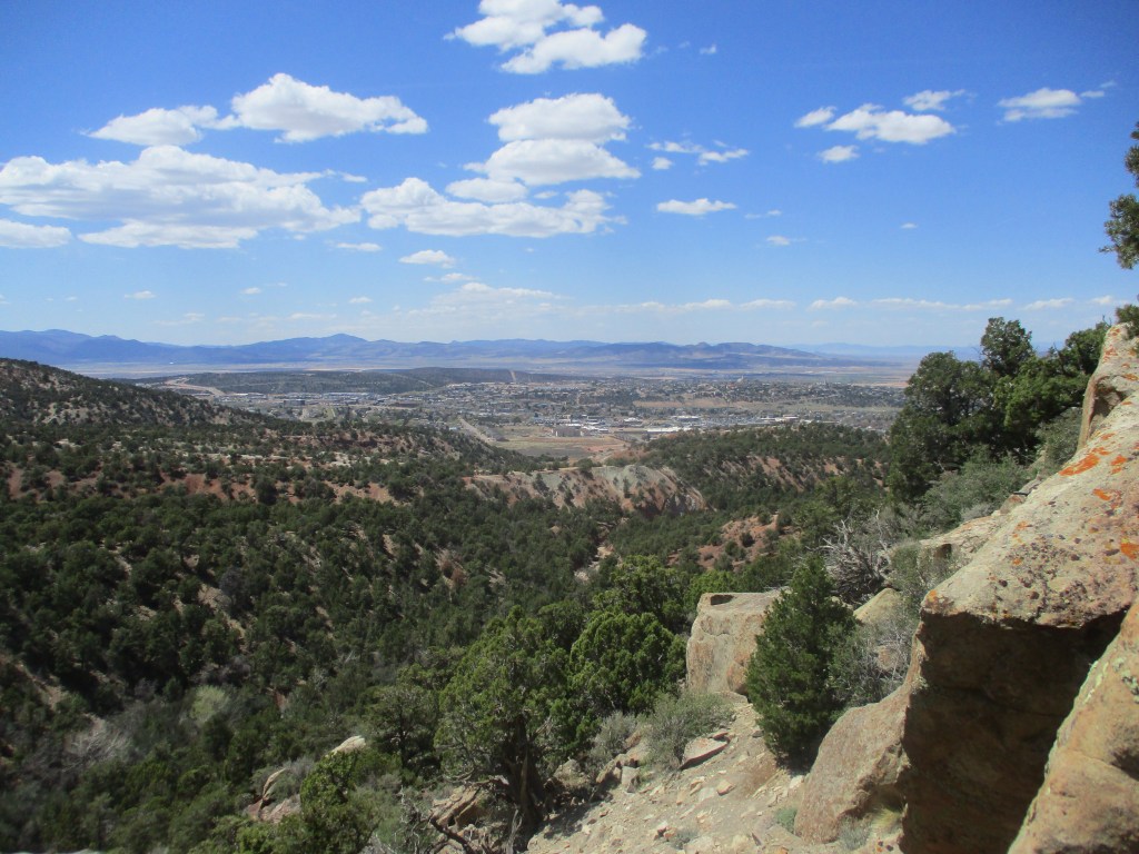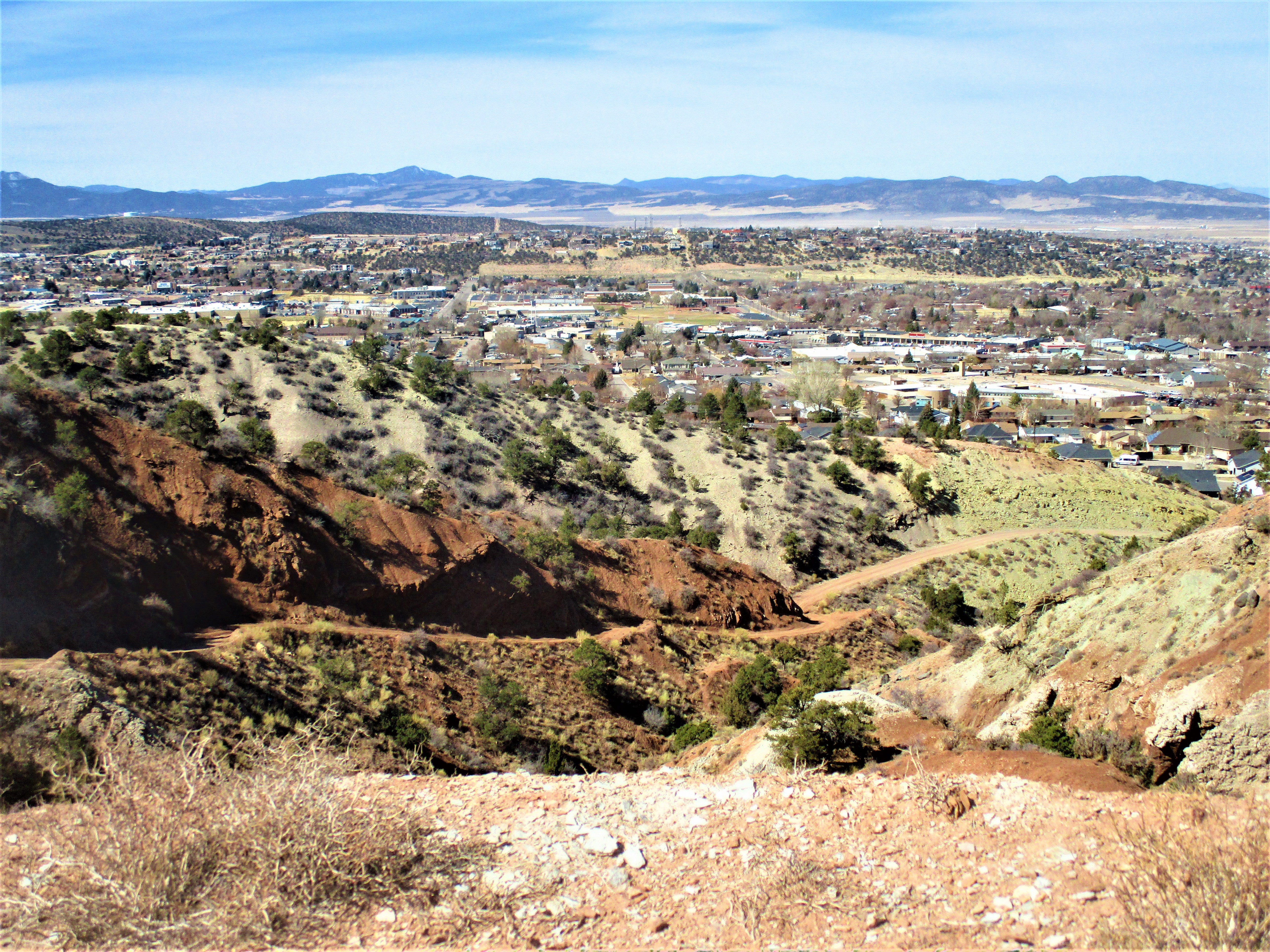 The trail leads to some nice views of the colorful terrain below – and some city views as well.