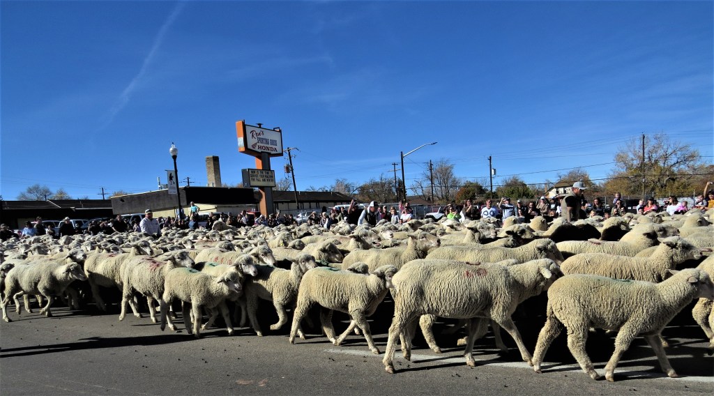 Dave and Jan have enjoyed several visits during their five years in Cedar City from one of their former neighbors in Brea, California – Pattie Shew. Pattie, who lived two doors north of the Balsleys on Redwood Avenue in Brea, has taken a liking to Cedar City, and has shown some fascination for the Heritage Festival which occurs near the end of October – including the sheep parade, an annual feature of the Heritage Festival parade. Here is a picture of the sheep parade from an earlier time in 2021.